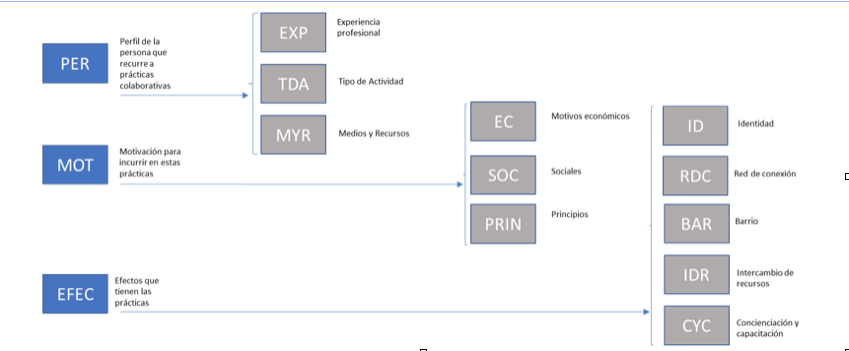 Según esta estructura se definen los siguientes códigos : PER que corresponde al Contexto y situación. MOT a las perspectivas y EFEC a las estrategias. “PER” nos facilitará identificar el contexto donde se desarrollan los proyectos colaborativos “MOT” las causas o maneras de pensar que llevan a las prácticas colaborativas y “EFEC” según los métodos y las técnicas que se utilizan el impacto o los efectos de estas prácticas hacia dónde se dirigen. Esta última categoría es de especial relevancia porque permite ampliar la magnitud y complejidad de la investigación. Con ID podemos identificar si los métodos empleados contribuyen a un sentido de pertenencia o de proyección en la ciudad o incluso son activadores de procesos , por ejemplo. RDC los efectos de los procesos participativos o la visualización de las propuestas participativas y su dinamización. BAR el valor del entorno y el espacio público. IDR intercambio de recursos que abren otras vías u oportunidades de negocio y CYC los valores positivos de las actividades colaborativas